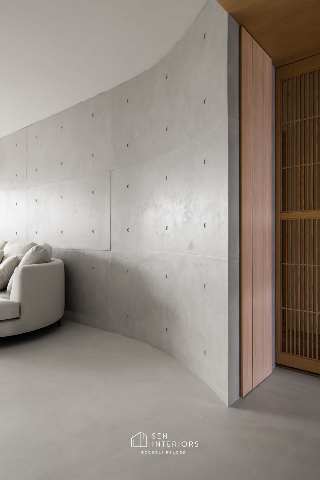客廳大面積採用清水模質感牆面,展現工業美學的純粹。不同於傳統平直牆面,大膽運用弧形轉角導引動線,消弭了空間的銳利感。牆面上的孔洞細節(Pinhole)增添了立面的韻律,與流線型沙發交相輝映。