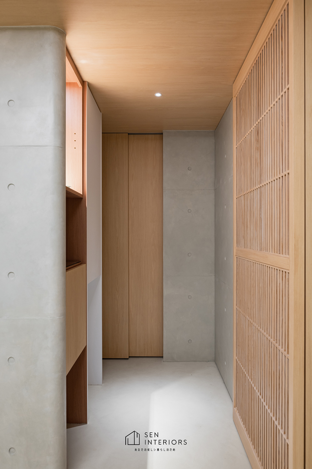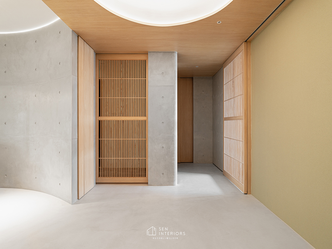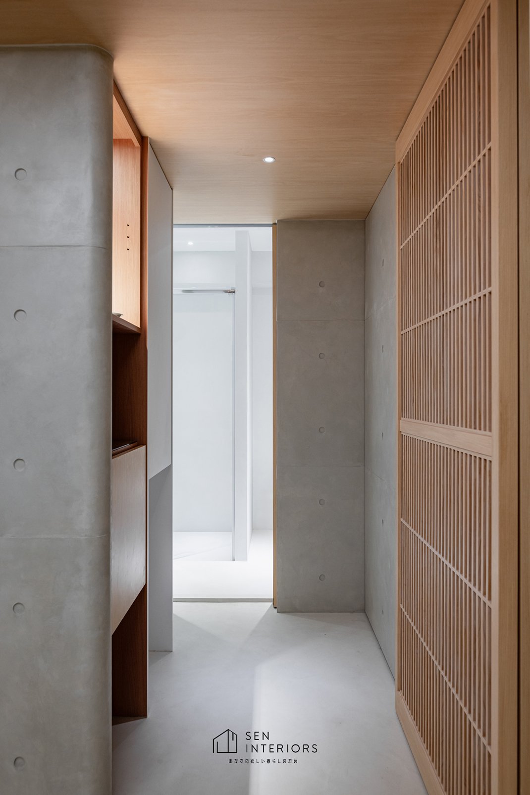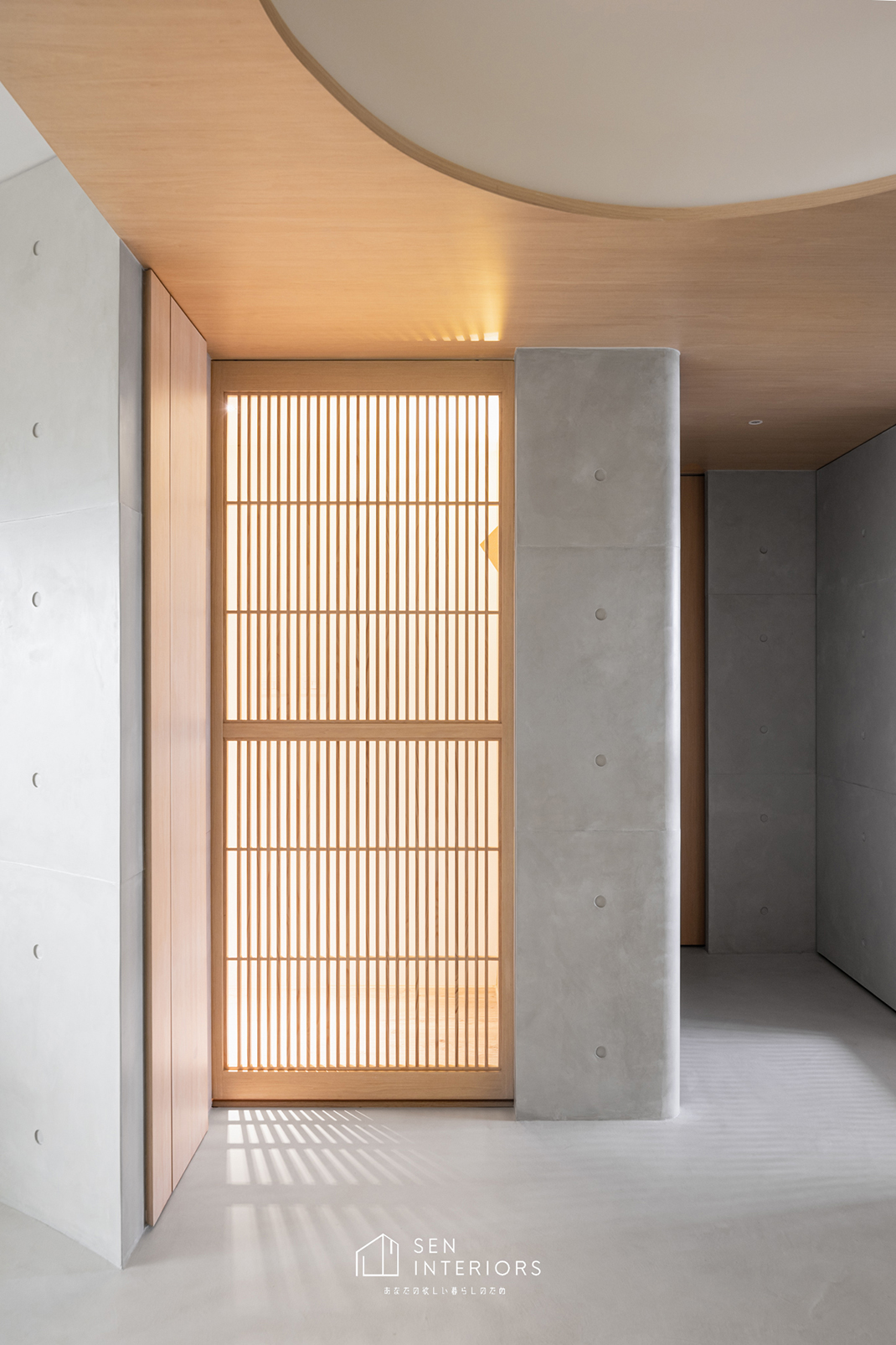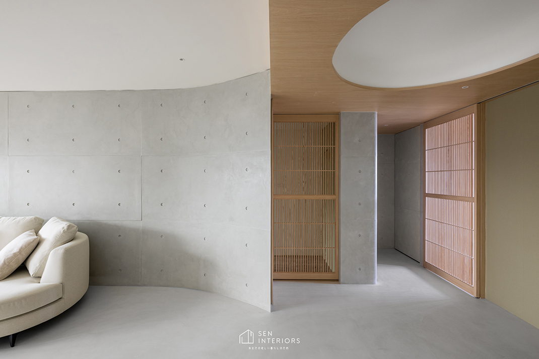 在冷調的清水模與無縫地坪中,巧妙揉合了大量的淺色木質元素。從玄關處帶有圓潤導角的懸空收納櫃,到後方的格柵推拉門,木質的溫潤平衡了水泥的冰冷,賦予空間家般的歸屬感。