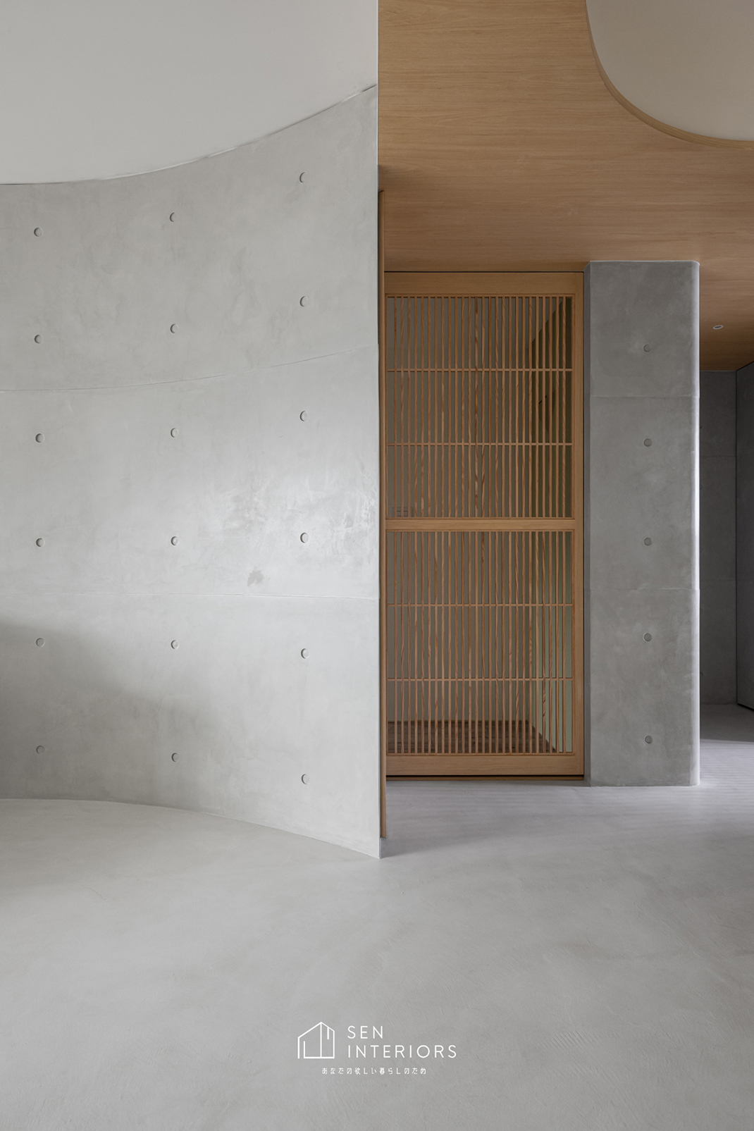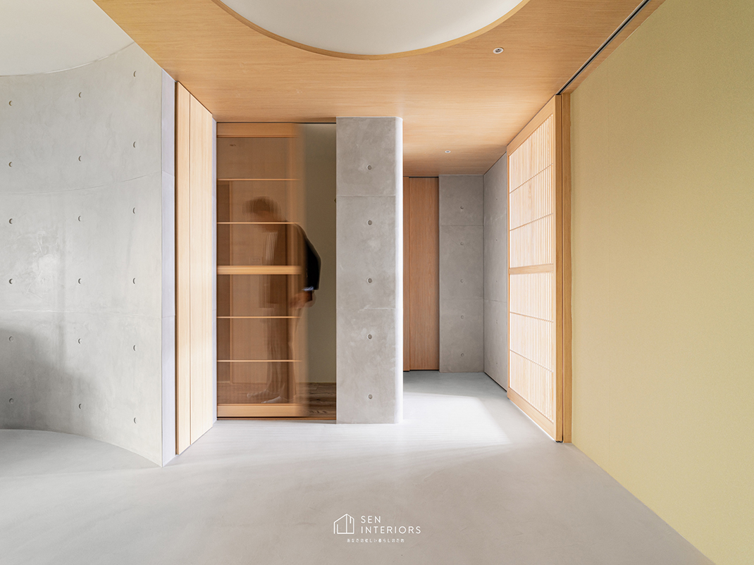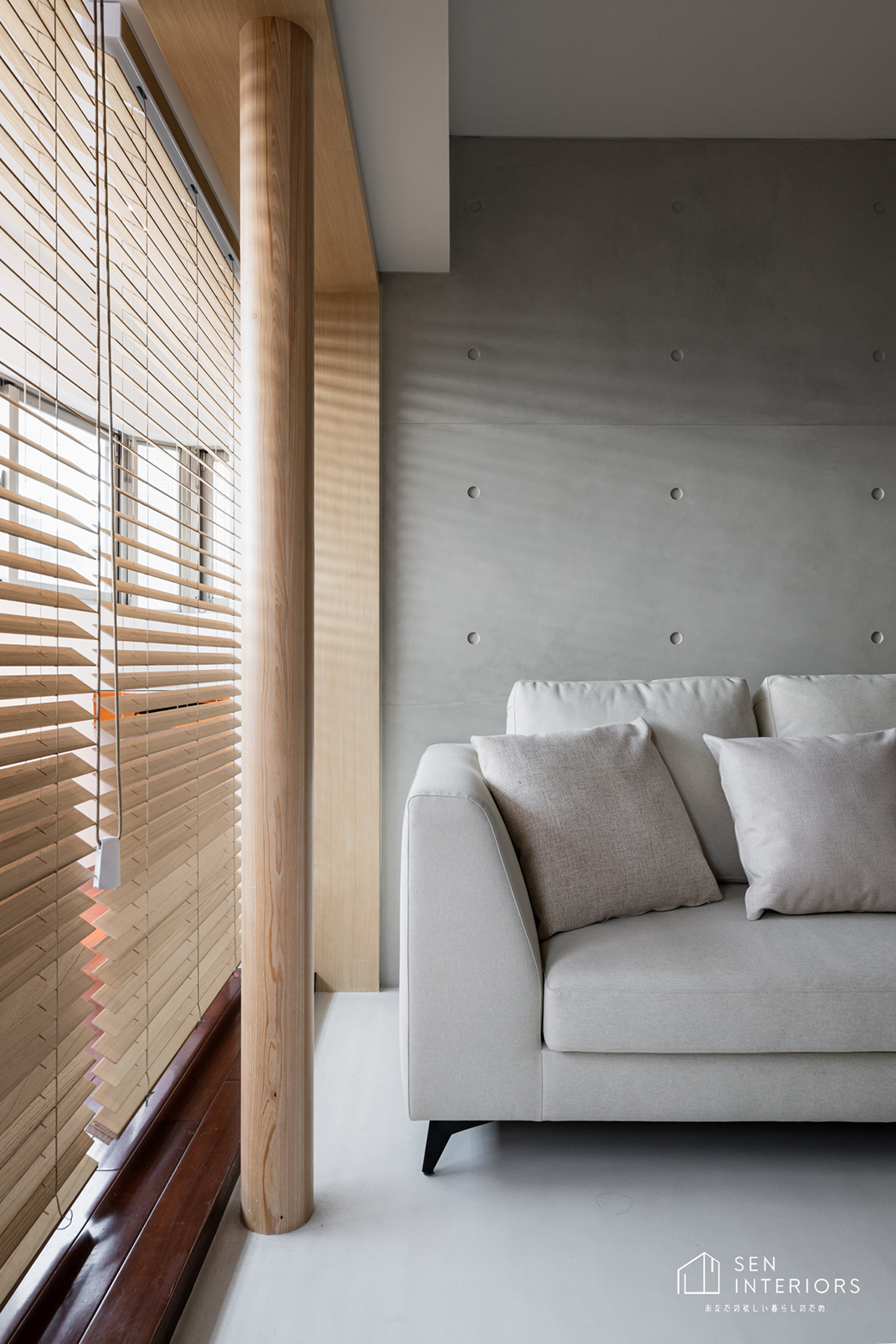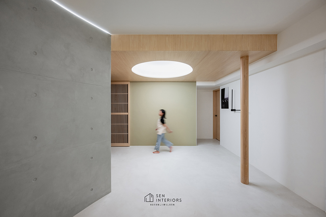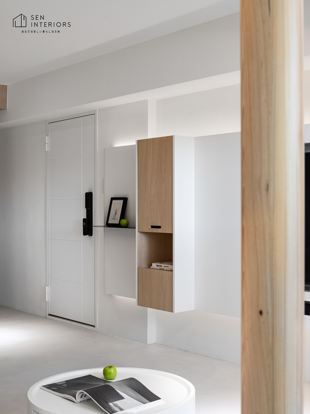 在冷調的清水模與無縫地坪中,巧妙揉合了大量的淺色木質元素。從玄關處帶有圓潤導角的懸空收納櫃,到後方的格柵推拉門,木質的溫潤平衡了水泥的冰冷,賦予空間家般的歸屬感。