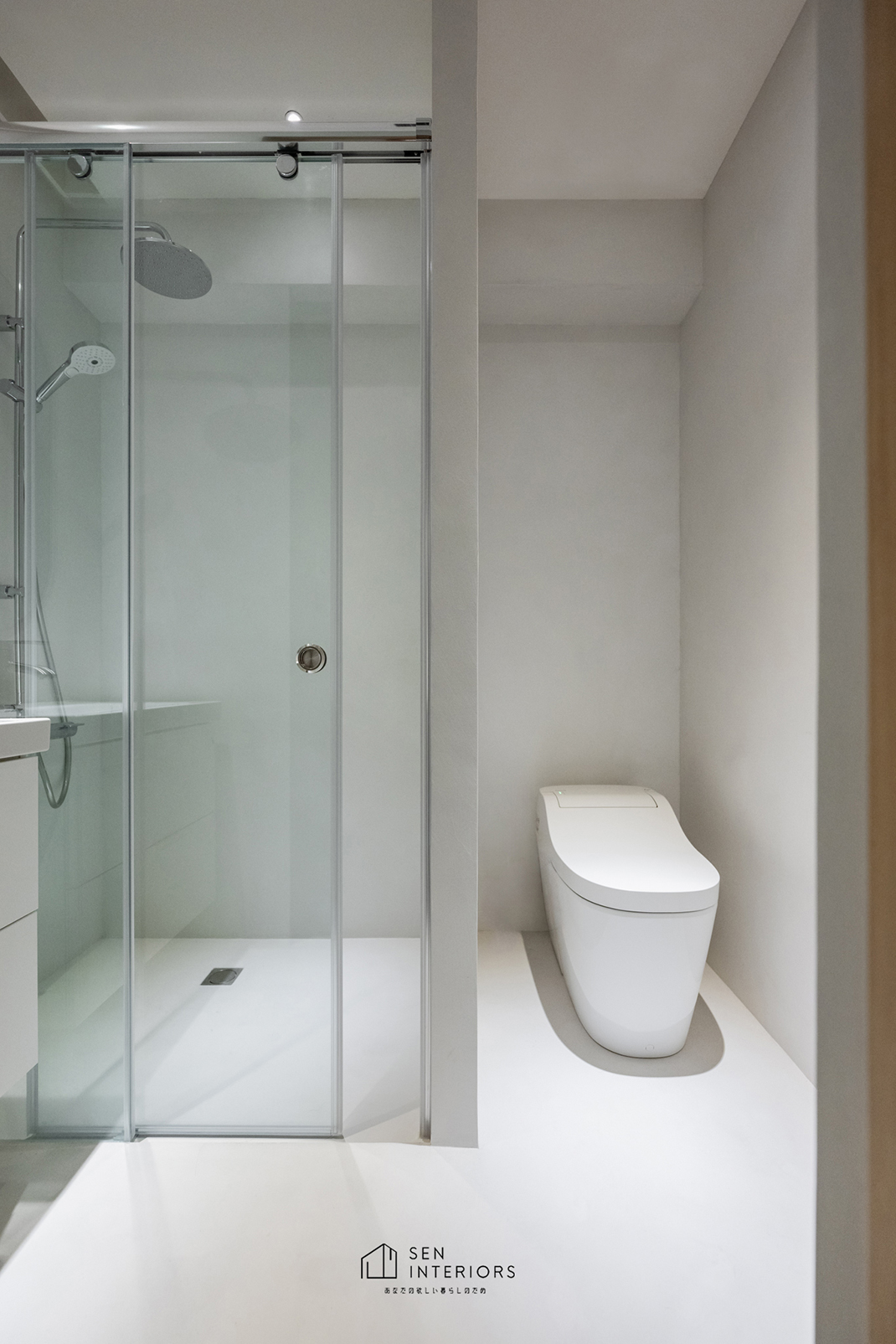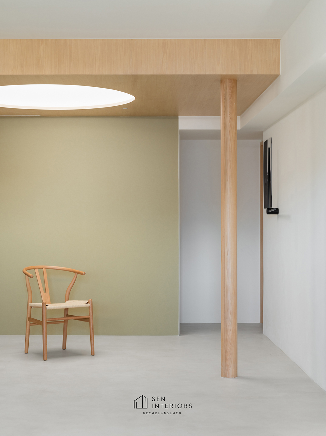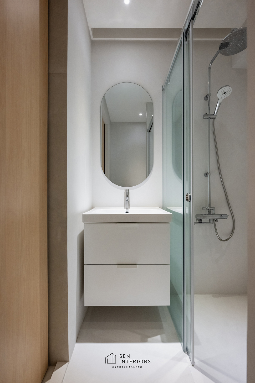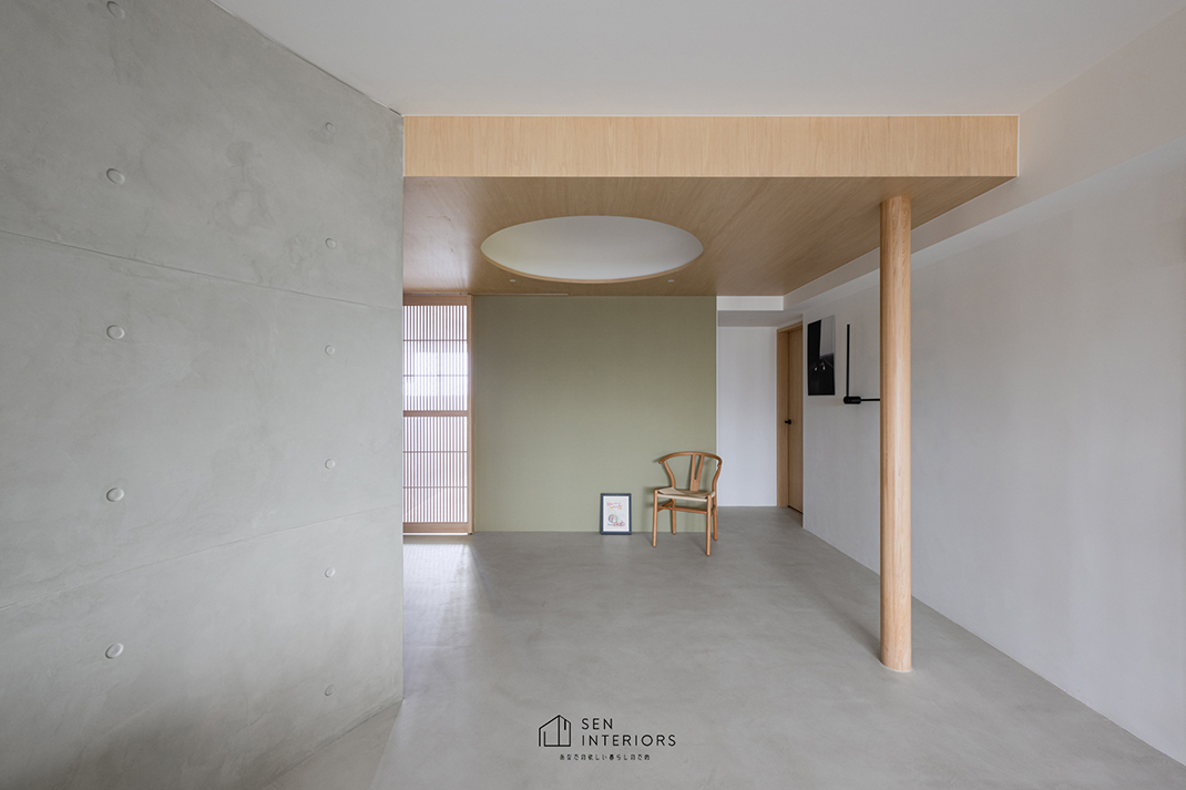 在冷調的清水模與無縫地坪中,巧妙揉合了大量的淺色木質元素。從玄關處帶有圓潤導角的懸空收納櫃,到後方的格柵推拉門,木質的溫潤平衡了水泥的冰冷,賦予空間家般的歸屬感。