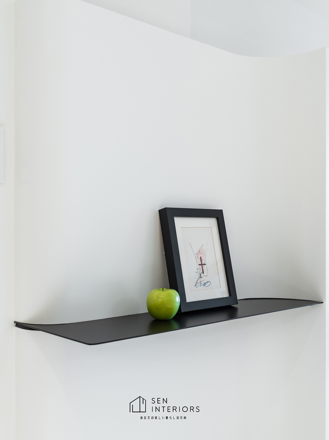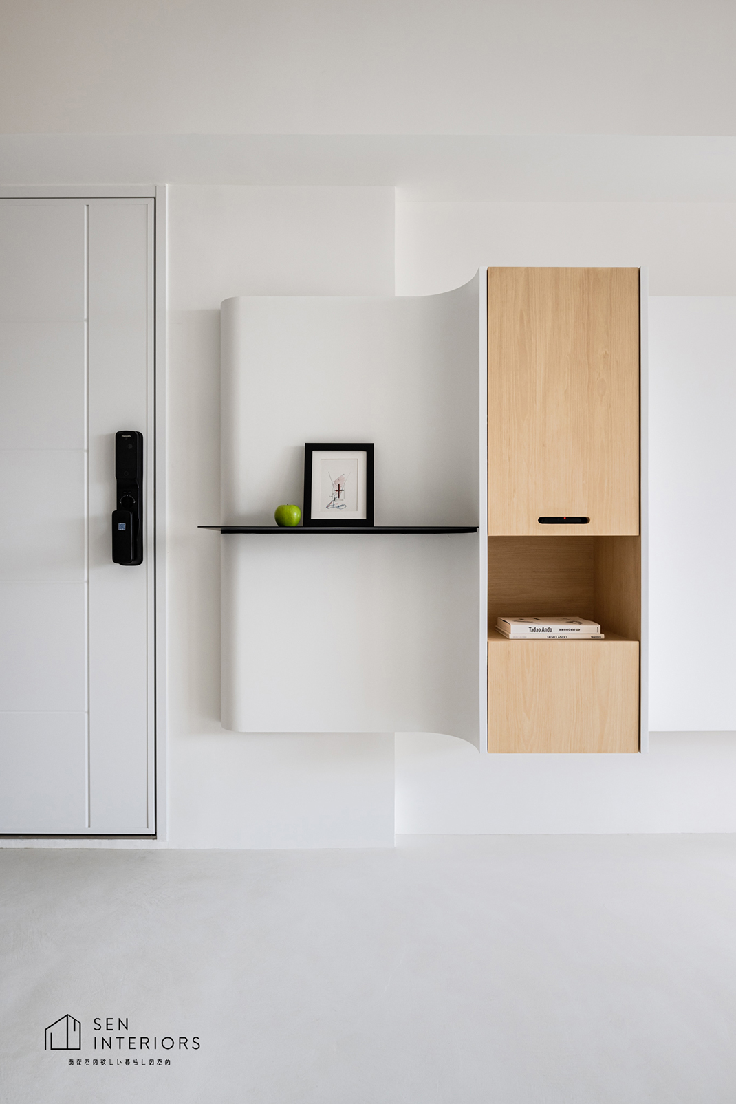 玄關區域採用一體成型的牆面設計,將層板與門板線條極簡化。黑色的極簡層板與門把成為白牆上的視覺支點,完美落實了「少即是多(Less is more)」的設計哲學。