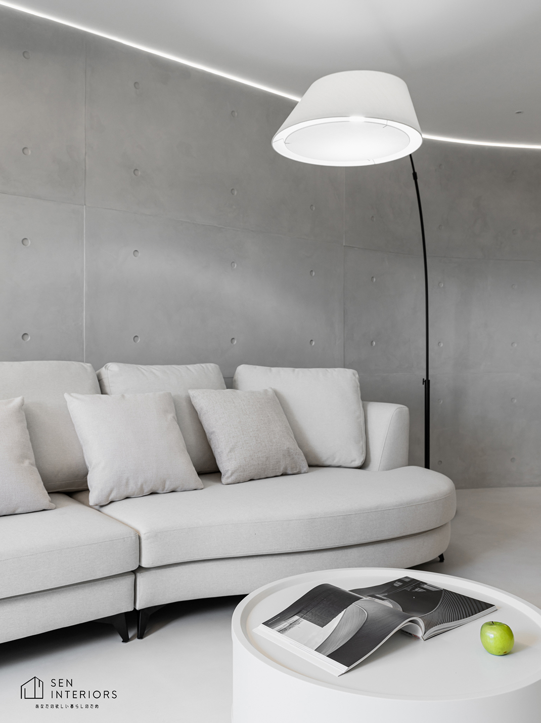 天花板與牆角嵌有隱藏式線性燈條,光線沿著曲面緩緩流瀉,不僅勾勒出空間的立體廓型,更在灰色調的空間中注入溫暖的層次感。搭配造型極簡的拋物線落地燈,營造出如同藝廊般的層次光譜。